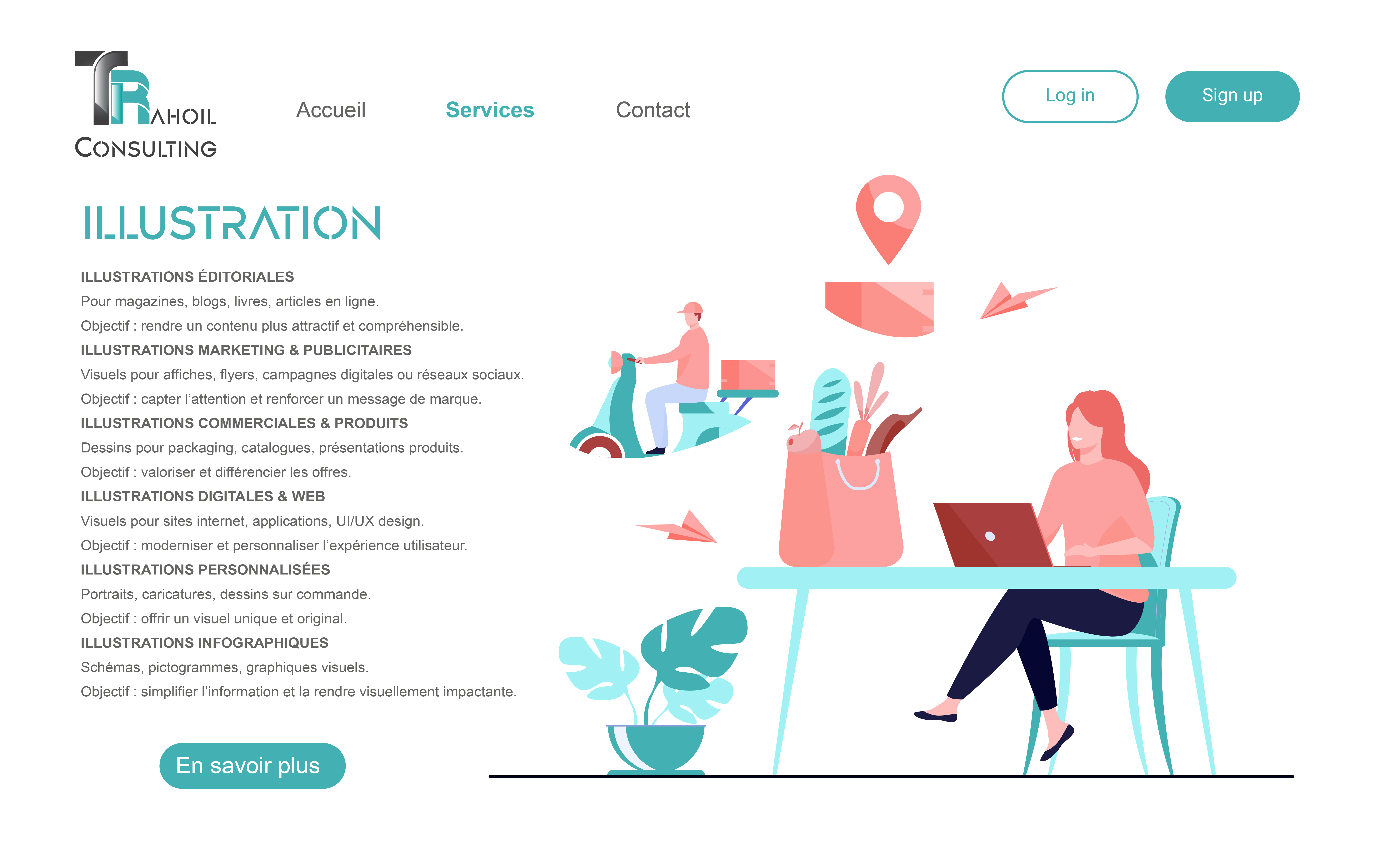 Chez TRahoil Consulting, la mission en illustration est de donner vie aux idées et aux messages des clients à travers des dessins personnalisés et des visuels créatifs qui allient esthétique, originalité et pertinence.